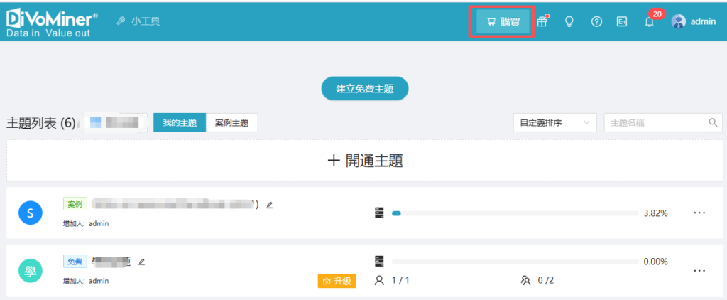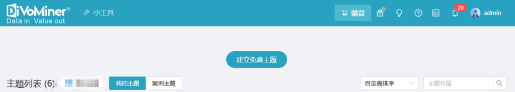 DiVoMiner®上一個研究專案等於一個“主題”。平台上的主題分為公益主題(永久免費)和研究主題(付費)。兩者在功能模組上完全一致,區別是資料量、類目數量和配套帳號數量。
