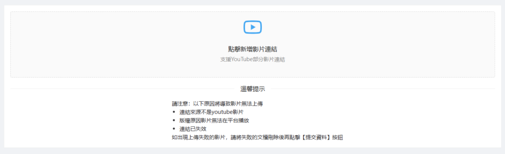 選擇一個資料庫,「上傳數據」頁面裏選擇“影片”,可以單條或批量上傳影片鏈接。目前支持youtube的部分公開許可權影片,可支持在DiVoMiner平台線上播放。針對部分非公開影片(如會員許可權影片)受源影片網站的限制,目前無法直接在DiVoMiner上觀看。已上傳的鏈接,也可能存在源網站鏈接變動失效等情況。