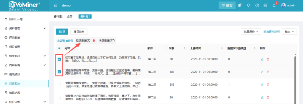 如何使用品質監控中的篩選? Created 17 9 月, 2020 Author ersadmin Category 使用秘籍 可以在「篩選」中設立條件,達成資料範圍的限定。例如,想要選擇特定日期的資料,可以選擇「日期」欄位,右側選擇一個時間段,點選「確定」,完成資料篩選。 TIPS:允許設立多個條件,點選條件右側「+ 」 新增條件。「全部條件」意思是多個條件之間是「和and」關係,即是篩選同時滿足多個條件;「任意條件」是滿足下列條件的任意一個就入選。 也可以手動勾選資料,方便後續對不同的資料進行操作。 Was this article helpful? Yes No
