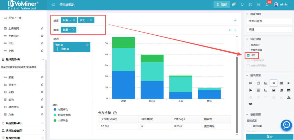 「統計分析」「即時統計」頁面,點小加號創建新圖表,將兩個分類變數拖入“維度”欄中,“數值” 欄保留“數量”欄位,右側選中“卡方”檢驗值,查看“維度”欄中的兩個變數的關聯性。