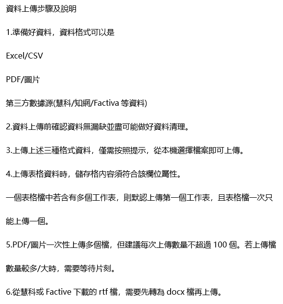 支援Excel、PDF、圖片和第三方資料來源等資料檔案格式。選擇對應格式,點選或將檔案拖曳到上傳區域。