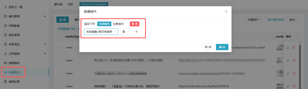 在內容編碼過程中,編碼員可以留言給話題管理員,管理員可在「品質監控」頁面查看編碼員留言,使用「篩選」-“系統變數”中“是否有留言”右側打勾,篩選出有留言的內容。