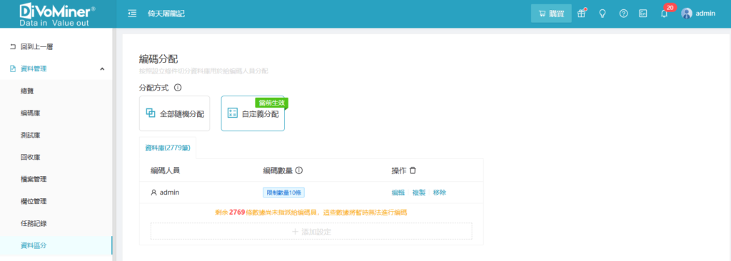 在「資料管理」-「編碼分配」頁面下,可以選擇預設的“全部隨機分配”和“自訂分配”兩種模式,在“自訂分配”模式下,可以設定每位元編碼員的編碼數量,也可以根據文本內容、欄位設置分配條件。
