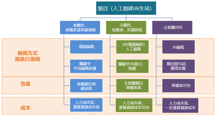 AI編碼適用於主觀、客觀類目題目,準確度可控,需要設置類目提示詞,對類目選項下定義,需要消耗運算資源。可以和人工編碼員的結果進行進度檢驗,編碼結果可用在發表論文中。