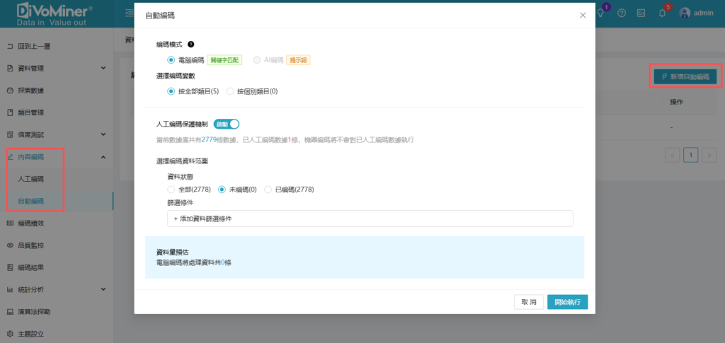設置妥當後,運行AI編碼的路徑方式與電腦編碼一致,均是在資料庫的「自動編碼」或「內容編碼」下的「自動編碼」進行資料範圍的設置和任務啟動。