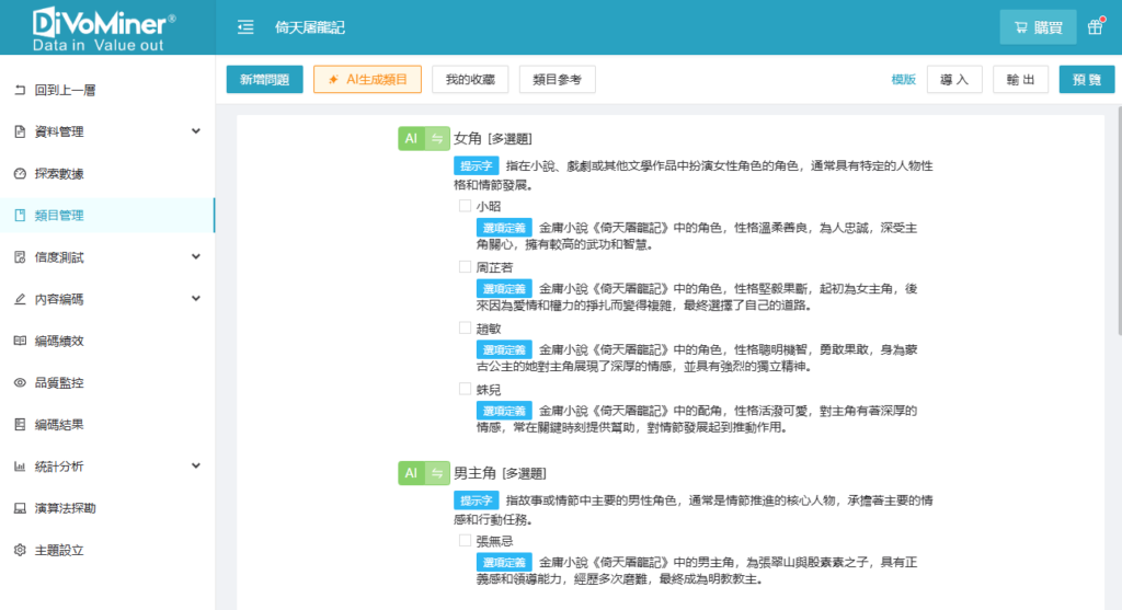 為了解決傳統內容分析法編碼操作繁瑣的問題,DiVoMiner平台的研發團隊想了不少辦法,最終確定採用結合了傳統內容分析法、大資料技術、人工智慧的創新執行方案,在內容編碼的方式上,提供了人工編碼(可電腦、AI輔助)、電腦編碼和AI編碼三種方式。