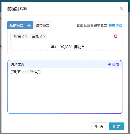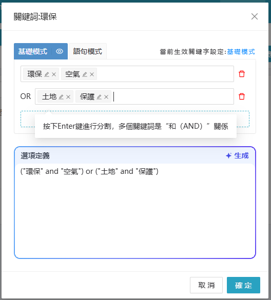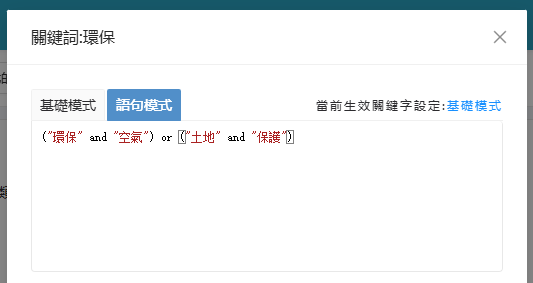 目前關鍵字設定提供兩種輸入模式:基礎模式和語句模式。基礎模式輸入關鍵字的方式相對簡單,而語句模式建構方式稍微複雜,但是也相應可以支持到較為複雜的設置條件。