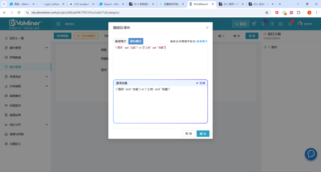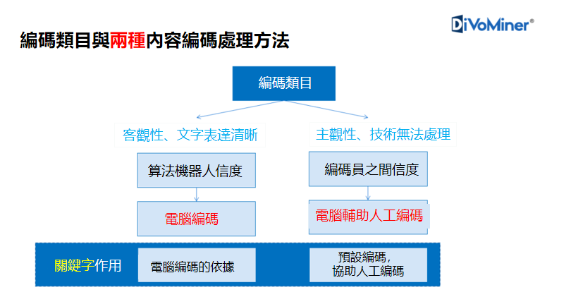 - 在電腦編碼的場景下,關鍵字是機器判斷的邏輯依據。即設置關鍵字後,在編碼過程中就可以執行機器輔助人工編碼了。